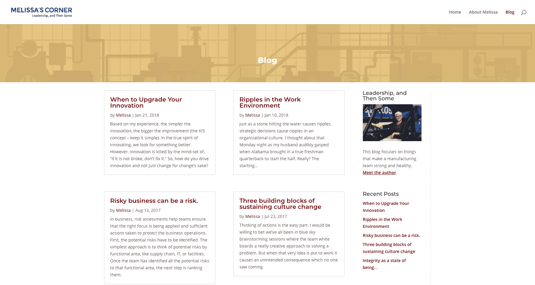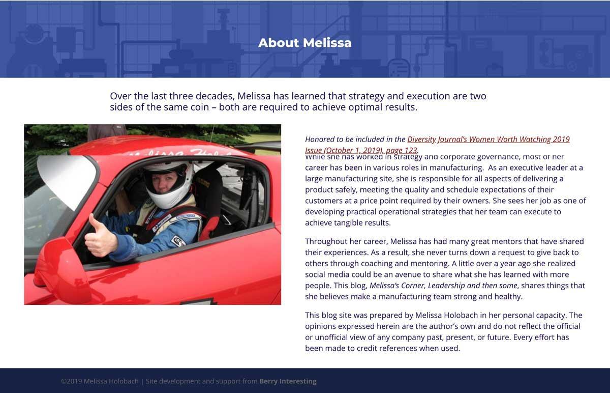 When Melissa Holobach received her most recent award for her professional accomplishments, she wanted a web presence that truly reflected her professionalism, experience, and expertise as an executive in manufacturing. She contacted Berry Interesting for a basic WordPress website rebuild that would reflect her professional image and could also handle the anticipated new traffic from the press surrounding her award . After reviewing the original WordPress site, they decided that Berry Interesting Productions should build a new, 4 page site using the Divi Builder.