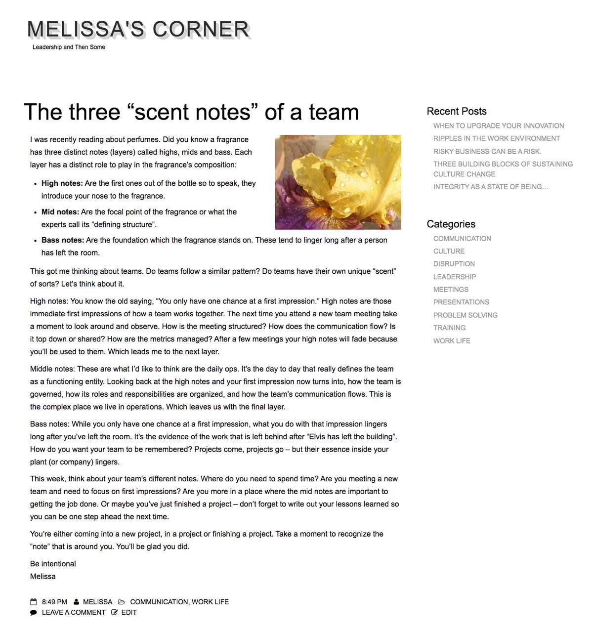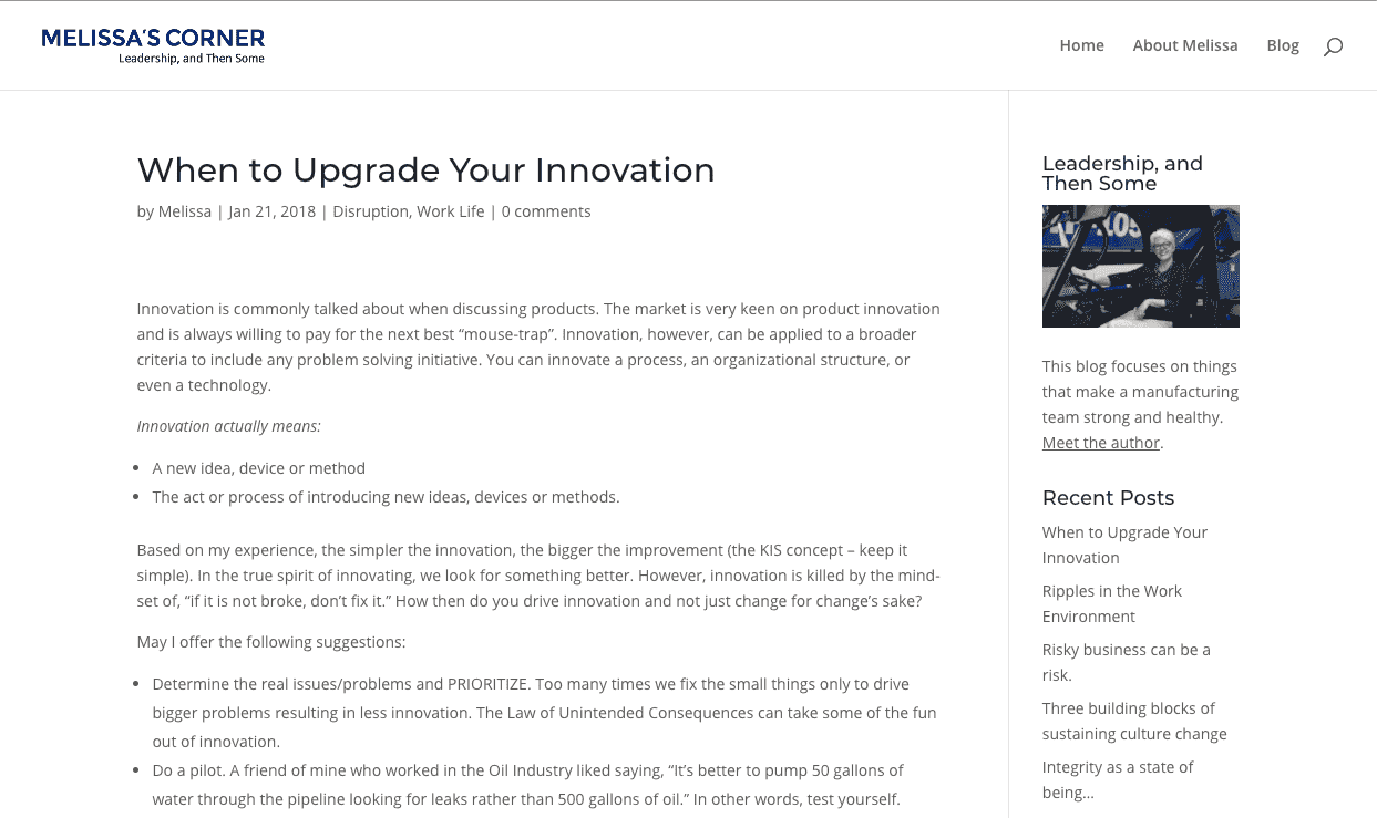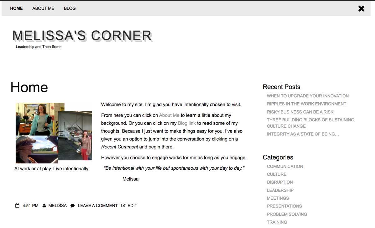 The primary focus of this rebuild was to maintain the presence of “Melissa’s Corner: Leadership, and Then Some” without any major redirection. The public web presence already established was sufficient. The content was rich and professional. So, what was Melissa’s Corner 2.0 going to be like?Â